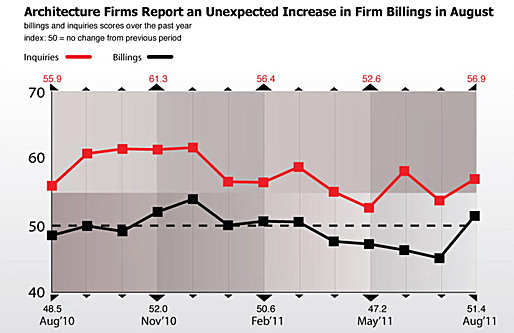 On the heels of a period of weakness in design activity, the Architecture Billings Index (ABI) took a sudden upturn in August. As a leading economic indicator of construction activity, the ABI reflects the approximate nine to twelve month lag time between architecture billings and construction spending. The American Institute of Architects (AIA) reported the August ABI score was 51.4, following a very weak score of 45.1 in July.